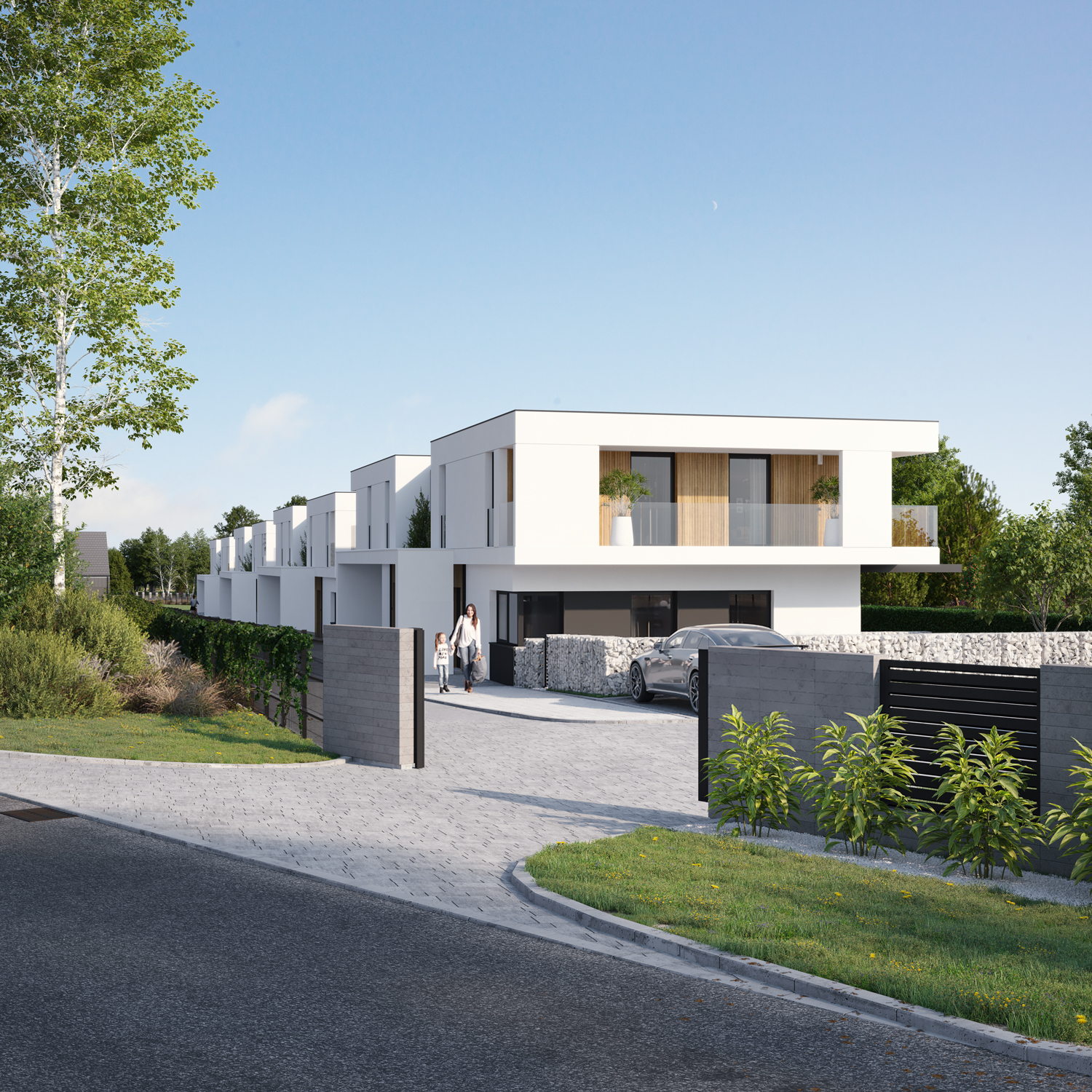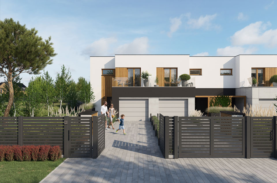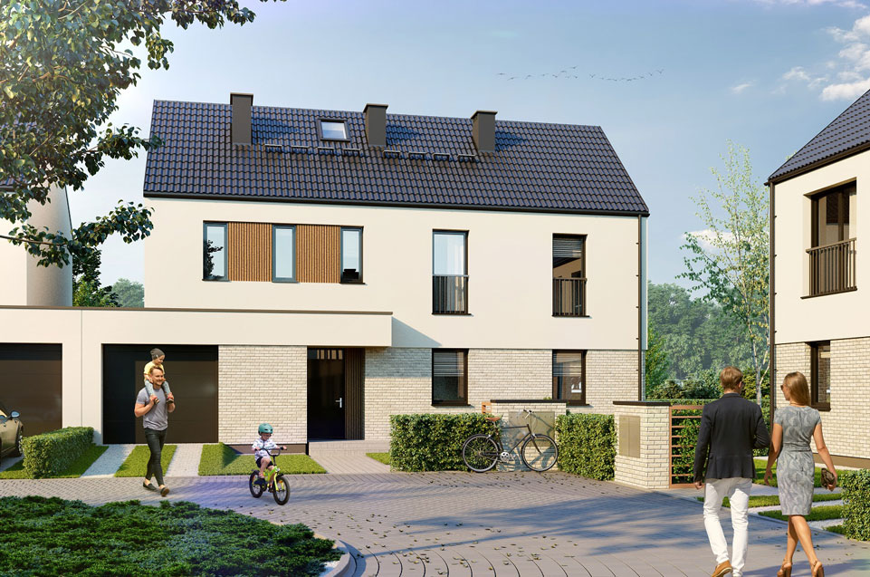 Każdy z nich oferuje 130 m² starannie zaprojektowanej przestrzeni, prywatny ogród, garaż w bryle budynku oraz dodatkowe miejsce postojowe.